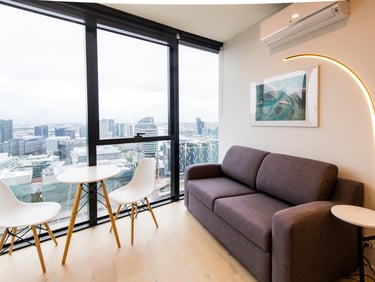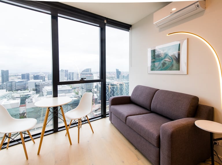 Cozy two-bedroom urban sanctuary in Melbourne, stunning Docklands sea views, recharge in a stylish living area, and relish the convenience of Southern Cross Station nearby. With high-end amenities and award-winning architectural design.